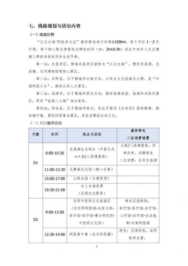 融合山東聊城(江北水城)的地方特色和旅游資源,設(shè)計(jì)出一條為期六天的“康養(yǎng)+旅游”活動(dòng)路線,將聊城東昌湖、阿膠城等特色景點(diǎn)進(jìn)行串聯(lián),搭配中醫(yī)理療、阿膠養(yǎng)生體驗(yàn)等康養(yǎng)項(xiàng)目,兼顧休閑觀光與健康調(diào)理,為“銀發(fā)族”打造沉浸式康養(yǎng)度假之旅。