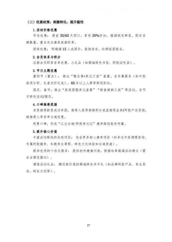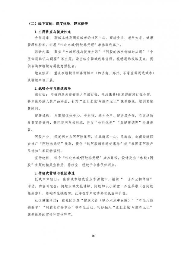 旅行社:與省內(nèi)及周邊省份大型旅行社、專注康養(yǎng)/銀發(fā)游的旅行社合作,將本線路納入其產(chǎn)品手冊(cè),針對(duì)“江北水城·阿膠養(yǎng)元記”康養(yǎng)路線,培訓(xùn)其銷售顧問。