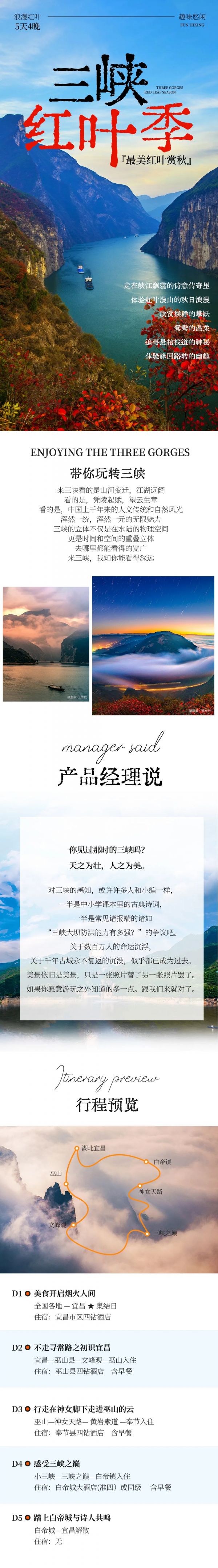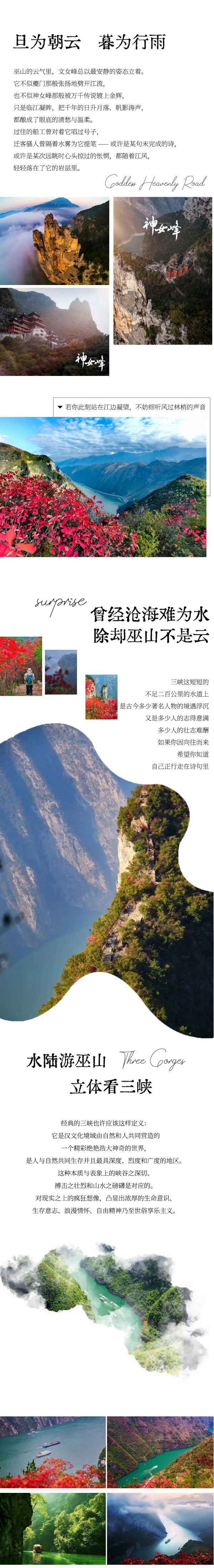 A:只要不是大暴雨,行程都是可以正常走的,請自備雨衣。秋雨蒙蒙的時候,巫峽上空的云霧翻騰,十分壯觀,我們徒步三峽畫廊從上往下俯瞰巫峽,就完全能理解詩人元稹寫下“除卻巫山不是云”這句詩的時候的心情了!