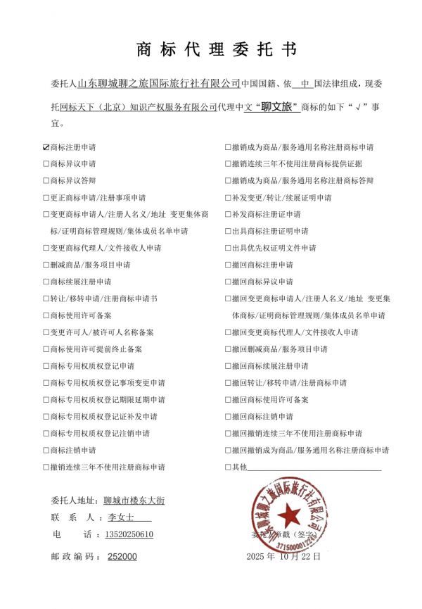 2025年10月22日山東聊城聊之旅國(guó)際旅行社有限公司委托網(wǎng)標(biāo)天下(北京)知識(shí)產(chǎn)權(quán)服務(wù)有限公司代理中文“聊文旅”商標(biāo)事宜。