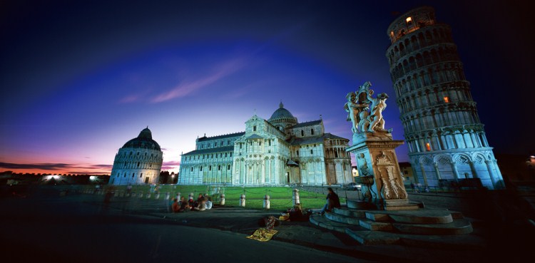奇跡廣場又稱主教堂廣場,位于意大利托斯卡納大區(qū)比薩市中心,廣場上有四大建筑: 主教堂、比薩斜塔(鐘樓)、圣喬凡尼洗禮堂、洗禮堂墓園,廣場周圍還保留著古代的城墻和城門,中間有大片的草地。奇跡廣場上始建于1063年的這組建筑深刻影響了從11世紀到1284年的建筑發(fā)展和14世紀的藝術(shù)發(fā)展,堪稱中世紀基督教建筑的典范。教堂大廳中的銅制吊燈被稱為“伽利略吊燈”,當年19歲的伽利略在教堂內(nèi)觀察到吊燈的擺動,發(fā)現(xiàn)了小擺動的等時性定律,這是他動力學研究的序幕,在比薩斜塔頂?shù)?ldquo;兩個鐵球同時落地”的實驗則使他得出了自由落體定律。圣喬凡尼洗禮堂則是意大利最大的洗禮堂。至于奇跡廣場的得名,則是來自于意大利作家鄧南遮1910年出版的一部小說中的句子“Ardea旋轉(zhuǎn)了基督的天空,旋轉(zhuǎn)了奇跡的草地。”