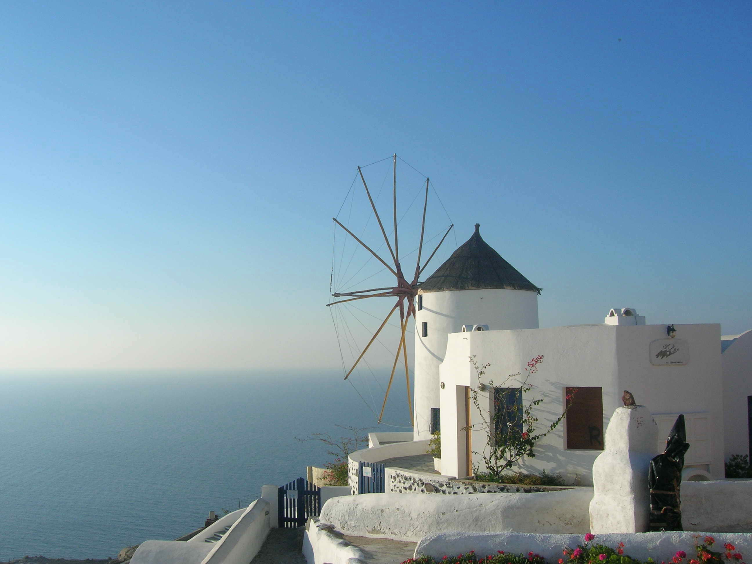 米克諾斯島是希臘南部基克拉澤群島中的一座,也是愛琴海上最享盛名的度假島嶼之一。島上居民很少,每年大約半年的非旅游時(shí)間,島上相當(dāng)安靜。四月以后,旅游季節(jié)開始了,來自世界各地的游客就像候鳥一樣絡(luò)繹不絕地飛來島上,享受地中海的陽光和海灘。在島上漫步,看到房頂都是用大石塊壘起的平頂,覺得很奇怪。問了當(dāng)?shù)氐木用窈蟛胖?,島上冬天寒冷,風(fēng)特別大,只有這些結(jié)實(shí)的屋頂才能抵御寒風(fēng)。在島西南面海邊的小山丘上,有5座基克拉澤式的風(fēng)車,這是米克諾斯島的標(biāo)志。
