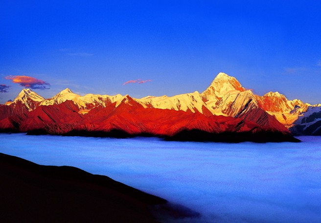 貢嘎山海拔7556米,是四川省最高的山峰,被稱為“蜀山之王”。山區(qū)高峰林立,冰堅(jiān)雪深,險(xiǎn)阻重重,是中國海洋性山地冰川十分發(fā)育的高山之一,在登山運(yùn)動和科學(xué)研究中占有十分重要的地位,是一座極受登山愛好者青睞的名山。