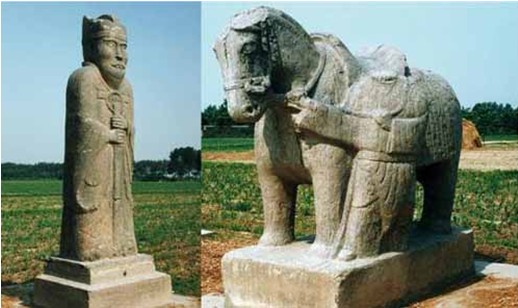 韓氏墓地石刻群 古代石刻群。位于莘縣董杜莊鄉(xiāng)梁丕營村東北。系唐末魏博節(jié)度使韓允中及其父韓國昌墓葬神道石刻群。墓葬坐北朝南,地表封土已平。石刻存有韓允中墓碑、韓國昌神道碑、墓表、豕、羊、馬、武士俑。韓允中墓碑和韓國昌神道碑形制大小基本相司。碑身與碑額為整石雕出,通高6.8米、寬2.13米、厚0.77米。額上浮雕6條龍,曲折盤繞,層次分明,龍首飾在碑首側(cè),碑首正中留有圭字形額。碑文多有殘缺,可辯者有2500余字,書體工整秀勁,波折險峻,有褚體韻致。墓表,位于神道碑的最南端,八棱形,通高3.49米,表首圓形,飾仰蓮,座方形。八棱柱體上刻有宋紹圣二年的簡短文字,記敘了宋代補添神道石刻的經(jīng)過。石豕,首殘,殘高1.12米。肌肉雄健,四足有力,蹲坐于方形基座上,隱露出勇猛不可侵犯的樣子。石羊,高0.92米,俯臥在長方形基座上,雙角大而彎曲,安詳?shù)刈⒁暻胺?。石馬,首尾長2.36米,高1.60米,著鞍轡,雕琢渾樸。馬左前雕出一胡服束帶牽馬石俑,頭部已殘,高1.40米,形象威嚴,版權(quán)所有山東聊城聊之旅國際旅行社有限公司,轉(zhuǎn)載必究!神態(tài)逼真。武士俑,頭戴冠,雙手持劍站立在方形臺基上,高2.73米,短頸,雙目圓睜,威武莊嚴。韓氏先世為河南汝南人,世為魏將,國昌官至貝州刺史,唐大中六年(852)卒。允中官至魏博節(jié)度使,乾符元年(874)卒。父子俱為顯官,故神道石刻之高大雄偉有異于常。1992年6月被山東省政府列為省級重點文物保護單位。