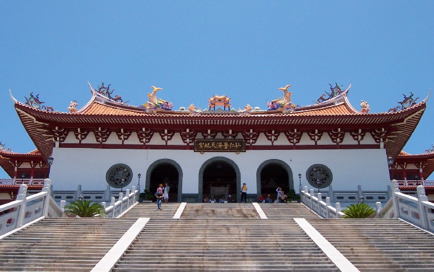 弘仁殿規(guī)模最小,只有3平方米左右,此建筑以山上巖石作后墻,再以花崗石作屋頂及兩邊墻身,殿內(nèi)也供奉天后,兩側(cè)墻身內(nèi)壁有天后之侍女及魔將浮雕,而天后神像則置于山石前,與正殿神龕區(qū)做法一樣,在石屋頂上,此殿也加上綠色琉璃瓦及飛檐式屋脊裝飾。位于最高處的觀音殿,主要由磚石構(gòu)筑而成,其建筑較為簡(jiǎn)樸,為硬山式做法。