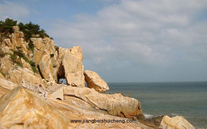 沿著濱海巖石鑿出的一條石徑前行,過了一座石橋,前邊便是“飛戟洞”和“斧劈崖”,幾乎都與媽祖的傳說緊密相連。相傳早年,湄洲灣海域有一條鯉魚多年修煉成精,時(shí)常出沒作祟,為害漁民。百姓苦不堪言,只好求助于媽祖。媽祖勸鯉魚精棄惡從善,改邪歸正。鯉魚精不聽,繼續(xù)一意孤行。媽祖派龍?zhí)忧叭ナ辗?。龍?zhí)优c鯉魚精交手沒幾個(gè)回合就敗下陣來。媽祖左右將千里眼和順風(fēng)耳看在眼里,急在心里。千里眼揮起斧頭猛力從云中砍下去,鯉魚精沒有傷著,卻把這海巖齊刷刷地切開,成了“斧劈崖”;順風(fēng)耳操起方天戟扎下去,扎出一個(gè)洞,就是“飛戟洞”。龍?zhí)?、千里眼、順風(fēng)耳以三戰(zhàn)一,仍難以取勝。媽祖只好召雷公來助戰(zhàn)。雷公看到“三戰(zhàn)一”斗得正酣,便瞄準(zhǔn)鯉魚精的要害,一錘子打下去,便把鯉魚精打趴在地,成了“鯉魚十八節(jié)”景點(diǎn)。從“霧海尋燈”亭出來,到“讀海臺(tái)”,最后來到“龍洞聽潮”。如果是夏天,這里可是納涼的好地方,即使是炎炎酷日,這里也是清沁涼爽。坐下來歇息,聽海浪輕輕拍打礁石的聲音,令人心曠神怡。順著石階下去,又是一個(gè)人間仙境,仿佛與喧囂的塵世驀然隔絕。抬頭東望,眼前豁然開朗,大海煙波浩淼,一望無垠。如果是秋冬季節(jié),又恰逢滿潮時(shí)分,那狂風(fēng)巨浪拍擊巖的轟鳴聲,那此起彼伏的涌浪瀑出的浪花,激起的泡沫,讓懦弱者膽戰(zhàn)心驚,讓勇敢者激情奔放、壯志滿懷。人們?cè)谶@里都會(huì)充分感受到大自然的神奇莫測(cè),大海的千變?nèi)f化。再高明的藝術(shù)家面對(duì)大海的變幻也會(huì)感到藝術(shù)手段的貧乏和無奈。