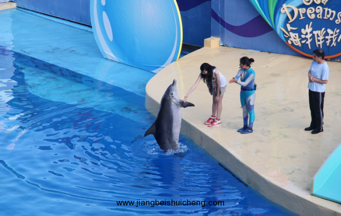 重頭戲——海洋劇場3:30開幕。前來觀看的游客一般會非常多,盡量提前半小時去,能坐陽光爆曬的座位。節(jié)目內容很多,兩只海獅招手、倒立、揮手、拿救生圈救人、對“落水者”進行人工呼吸……不知道與海獅kiss是啥味道。五只海豚則表演游泳比賽、跳高觸球、跨藍、空中翻身36周半、直立旋轉、仰泳等,真的是很有靈性。最讓我驚嘆的是那些團體動作,竟也能做得那樣整齊劃一,有板有眼。