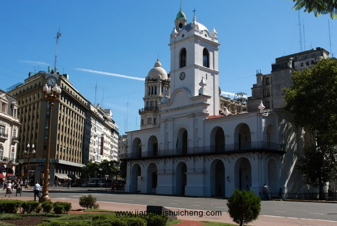 阿根廷國會大廈位于國會廣場西端,是阿根廷的立法機(jī)關(guān),大廈于1887年至1906年建成。大廈主體有4層,以白色大理石裝飾墻面,帶雕飾的希臘式立柱環(huán)繞整個(gè)建筑。大廈正中高高聳起一座穹頂塔樓,塔身半腰處,一輛青銅四架馬車凌空欲飛,最高處是直徑20米的青銅穹頂。建筑的氣勢與精美,不輸于華盛頓的國會大廈。屹立在大廈前面的兩會紀(jì)念碑氣勢宏偉,工藝精美。