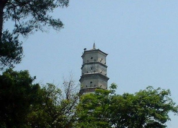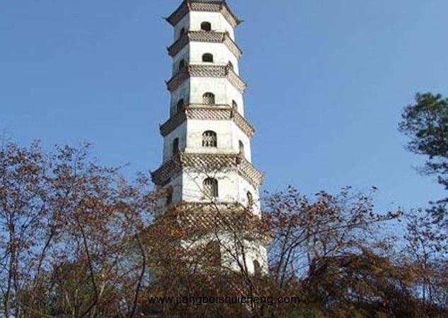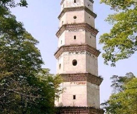 塔平面六邊形,底邊長(zhǎng)3.9米,七層樓閣式磚塔,通高36米,塔身疊澀出檐。底層以及三至七層正面各開券頂門,二層各面相間開長(zhǎng)方形、圓形窗,其余各層相間、上下相錯(cuò)開5個(gè)方形窗。塔頂六角攢尖。塔內(nèi)各層設(shè)木樓板和木樓梯。門額有阮元題刻的“秀發(fā)梧江”、“觀文成化”、“光射牛斗”等石匾。1982年維修,改木樓梯為鐵樓梯。