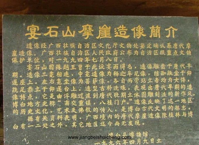 宴石寺正門上書有“宴石寺”三字。它的門聯(lián)和重門聯(lián)為:“宴會(huì)群仙地,石開一洞開”、“宴石鐘靈千古秀,仙橋毓秀萬(wàn)年居”聯(lián)首分別嵌上“宴石”和“宴石仙橋”顯然把宴石寺、宴石山、宴石仙橋三景融為一體。宴石山壁立如削,寺頂平坦,密草叢叢,荊蘿盤生,輕紗般的霧靄在林間回蕩飄逸。版權(quán)所有山東聊城聊之旅國(guó)際旅行社有限公司,轉(zhuǎn)載必究!往昔,山頂正中有一泓清泉,波光如鏡,池中五彩斑斕的菩薩魚與藍(lán)天白云相映,恍如神魚遨游蒼穹;山頂清泉從峭壁上飛瀉而下,擊中陡崖的凸處,濺起霧珠,被陽(yáng)光染成七色彩珠,仿佛為宴石寺石山披上一輪佛光,讓人更添神往。站在宴石山頂向東望去約10公里有雞婆石,它象一個(gè)正孵蛋的母雞蹲在雞窩中,在它的背脊上有一個(gè)歪著腦袋窺天的“雛雞”,筆者曾爬上過(guò)此山,僅用一個(gè)手指就算有百十人共同出力,也休想挪開它半寸。向南看,蜿蜒的南流江下游約3公里,在兩處山峽間有一個(gè)大平湖,這就是東漢伏波將軍馬援當(dāng)年為平交趾叛亂,動(dòng)用十萬(wàn)兵士疏鑿出來(lái)的馬門灘。向西看去,巍峨雄偉的云飛樟矗立天極,它的身后就是峰巒疊嶂的六萬(wàn)大山。向北觀看,遠(yuǎn)處是煙靄籠罩的博白城;中間有一座昂天嘯吼的獅子石山,它口中冉冉騰起熱浪直沖云霄;近處又是丹霞地貌最典型的紫陽(yáng)冠了,它像一定圓形的禮帽,扣在地表上。在宴石山頂,山風(fēng)習(xí)習(xí),颯氣沐身,環(huán)顧四周,頓覺宴石山成了宇宙的中心,整個(gè)乾坤都渺小了。再有江東岸寺西石壁上鐫有神像三尊。摩崖造像雕鑿在離河面約15米的紅砂巖石崖壁上,高三米。中龕坐佛一尊,左右龕為一佛二菩薩。佛像頭部長(zhǎng)方形,兩耳垂肩,身披袈裟,袒右肩,結(jié)跏跌坐于束腰式須彌高蓮座上。左右兩龕佛座各辟一小龕,內(nèi)雕獸頭。造像無(wú)題記,從雕刻風(fēng)格及其造型、面像、服飾分析,應(yīng)是隋唐或水稍前刻成,自治區(qū)旅游局認(rèn)定是“廣西第一摩崖”,是目前廣西境內(nèi)已知年代最早的摩崖造像之一。摩崖造像地處漢、唐中原交趾(今越南)交通要道南流江畔,為研究我國(guó)佛教的發(fā)展和南傳提供了可貴的資料。清道光十二年縣志載,摩崖旁“有臨江巨佛一座,高五十余丈,未窮何年所鑿”。遺憾的是,此巨佛在清末或民國(guó)初已倒塌跌落江中,現(xiàn)僅留佛座底裙,尚依稀可辨。