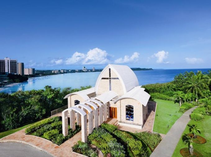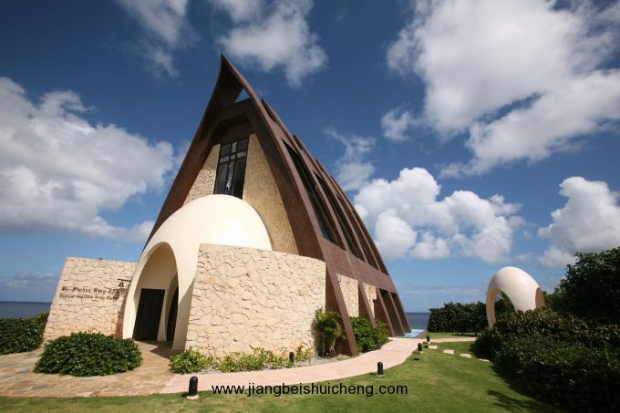 有近2000粒大小不同的施華洛世奇水晶從天花板垂下來,在陽光長(zhǎng)年普照的關(guān)島,加上海水的折射,令教堂內(nèi)不斷閃耀著不同的顏色。全白色的墻加上藍(lán)白色的玻璃窗,整個(gè)教堂就像一座水晶宮。
