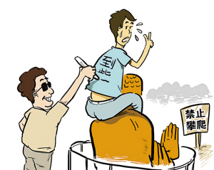 第二例,陜西李文春攀爬紅軍雕塑照相案。照片被微信傳出后,引起公眾的譴責。國家旅游局立即進行督辦,陜西省旅游局已將李文春已并列入“游客不文明行為記錄”。吳起縣勝利山景區(qū)因管理不嚴,被取消年度評先評優(yōu)資格。國家旅游局研究決定:⑴將李文春列入“全國游客不文明行為記錄”,期限10年;⑵吳起縣勝利山景區(qū)因管理不善,兩年內(nèi)不得參評A級景區(qū)。
