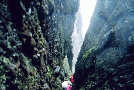 線狀侵蝕:又稱溝蝕.地坡上的土巖層受線狀流水侵蝕或地面成股徑流沖刷形成的各種大小不同侵蝕溝的過程.此處地縫為流水線狀侵蝕形成的侵蝕溝, 版權(quán)所有,山東聊城聊之旅國際旅行有限公司轉(zhuǎn)載必究!呈"V"字形,最窄處僅容一人通過.巖性為礫巖。