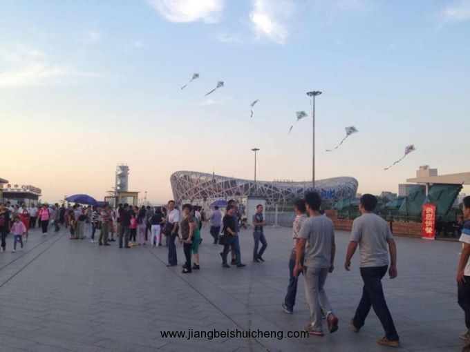 看天空,自由自在的風箏在鳥巢上空飛翔