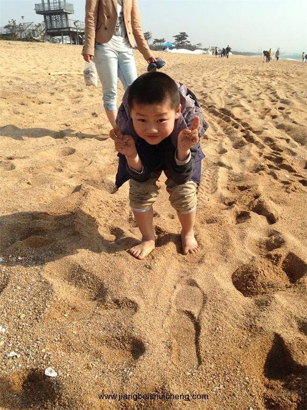 你看那個(gè)小男孩兒,被海浪打上來了吧,還是老實(shí)點(diǎn)兒玩沙子吧