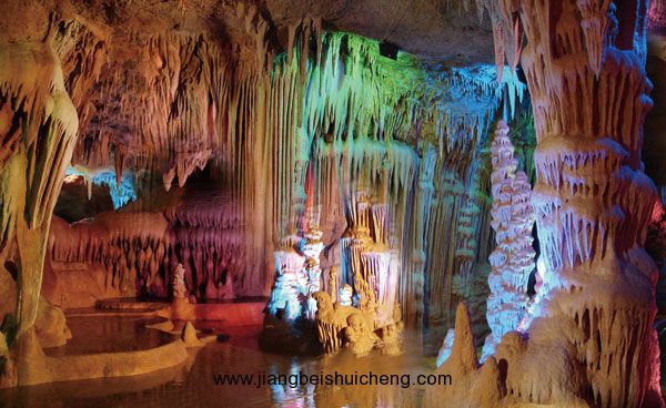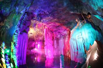終于,到了。我們在導(dǎo)游的帶領(lǐng)下,邁著悠閑地步伐,欣賞著大自然的鬼斧神工和無窮造化。石花、石柱、石筍、石幔、石瀑本身就已是栩栩如生,再加上現(xiàn)代化七彩燈光的襯托,更是美得不可方物。溶洞內(nèi)還有連接裂谷兩端的人工橋,橋兩側(cè)是散發(fā)著五彩斑斕色彩的石柱和石筍,同來的游客有個特搞笑的,扮起了阿凡達,抓住護欄左右翻滾,大家頓時笑聲一片。再往里走,裂谷深處,石瀑傾瀉而下,嘩嘩的流水聲在谷內(nèi)激蕩開去,宛若華美的樂章。更神奇的是,水是暖暖的,有的地方竟還氤氳出大片霧氣,置身其中,那感覺真是妙不可言。都說“桂林山水甲天下”,但在我看來,此山,此水,此谷,也是世外桃源,終會聞名遐邇。