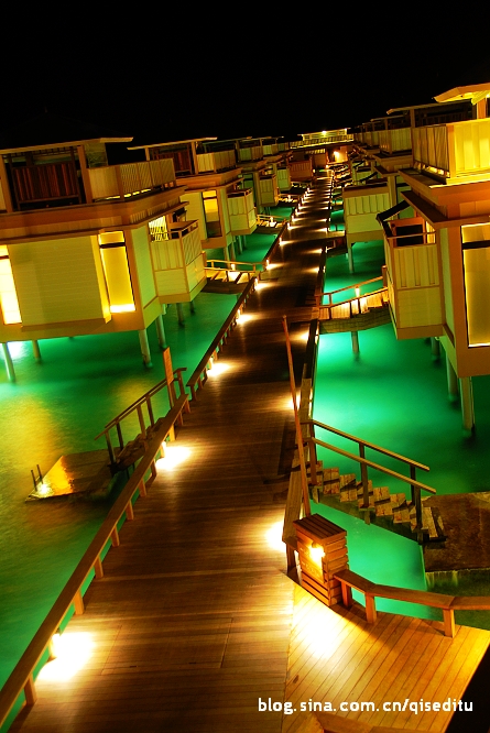 這就是維拉瓦魯?shù)乃衔萘?,通過一條木板走廊鏈接在一起,遠處綠色的那一片,就是主島,俗稱海龜島