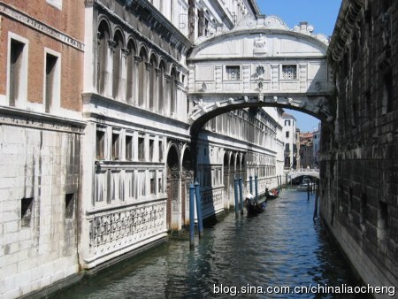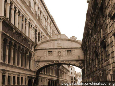 嘆息橋建于1603年,因橋上死囚的嘆息聲而得名。據(jù)說(shuō)戀人們?cè)跇蛳陆游蔷涂梢蕴扉L(zhǎng)地久,電影“情定日落橋”就在這取景的。嘆息橋兩端連結(jié)著總督府和威尼斯監(jiān)獄,是古代由法院向監(jiān)獄押送死囚的必經(jīng)之路。嘆息橋造型屬早期巴洛克式風(fēng)格,橋呈房屋狀,上部穹隆覆蓋,封閉得很?chē)?yán)實(shí),只有向運(yùn)河一側(cè)有兩個(gè)小窗,當(dāng)犯人在總督府接受審判之后,重罪犯被帶到地牢中,可能就此永別人世,在經(jīng)過(guò)這座密不透氣的的橋時(shí),只能透過(guò)小窗看看藍(lán)天,不自主的發(fā)出嘆息之聲,再向前走便要告別世間的一切了。有一個(gè)傳說(shuō):有個(gè)男人被判了刑,走過(guò)這座橋。 “看最后一眼吧!”獄卒說(shuō),讓那男人在窗前停下。窗欞雕得很精致,是由許多八瓣菊花組合的。男人攀著窗欞俯視,見(jiàn)到一條窄窄長(zhǎng)長(zhǎng)的貢多拉,正駛過(guò)橋下,船上坐著一男一女,在擁吻。那女子竟是他的愛(ài)人。男人瘋狂地撞向花窗,窗子是用厚厚的大理石造的,沒(méi)有撞壞,只留下一攤血、一個(gè)憤怒的尸體。血沒(méi)有滴下橋,吼聲也不曾傳出,就算傳出中,那擁吻的女人,也不可能聽(tīng)見(jiàn)。血跡早洗干凈了,悲慘的故事也被大多數(shù)人遺忘。只說(shuō)這是“嘆息橋”,犯人們最后一瞥的地方。且把那悲劇改成喜劇,說(shuō)成神話。