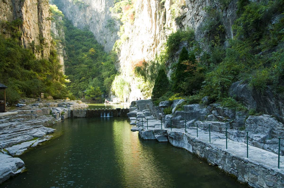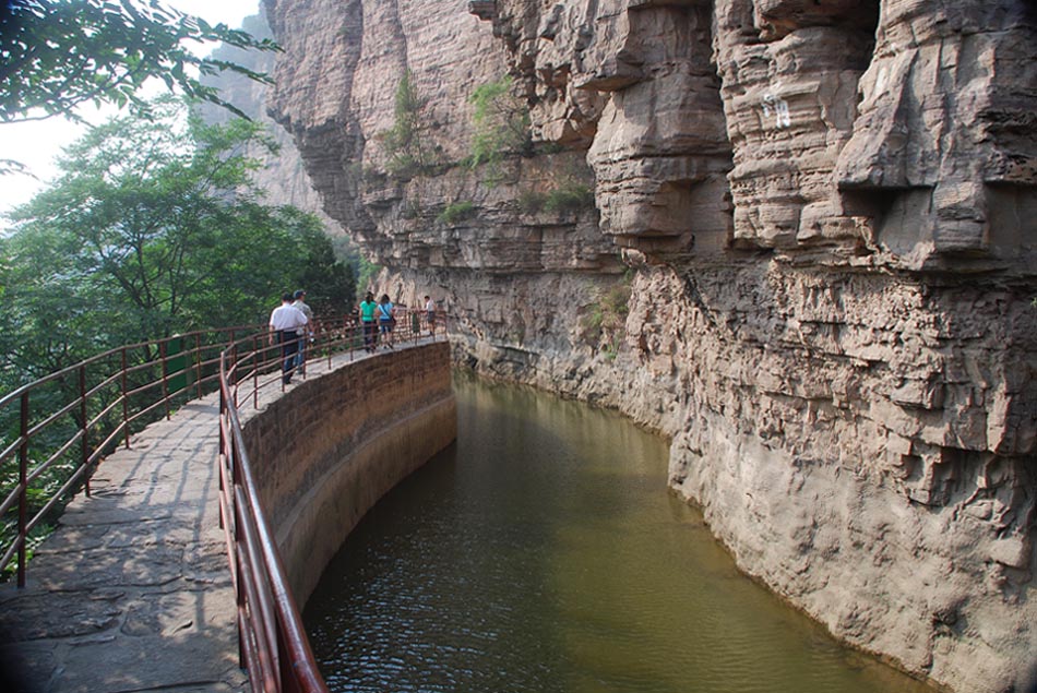 紅旗渠以濁漳河為源。渠首位于山西省平順縣石城鎮(zhèn)侯壁斷下??偢汕L70.6公里,渠底寬8米,渠墻高4.3米,縱坡為1/8000,設計加大流量23秒立方米,全部開鑿在峰巒迭嶂的太行山腰,工程艱險。
