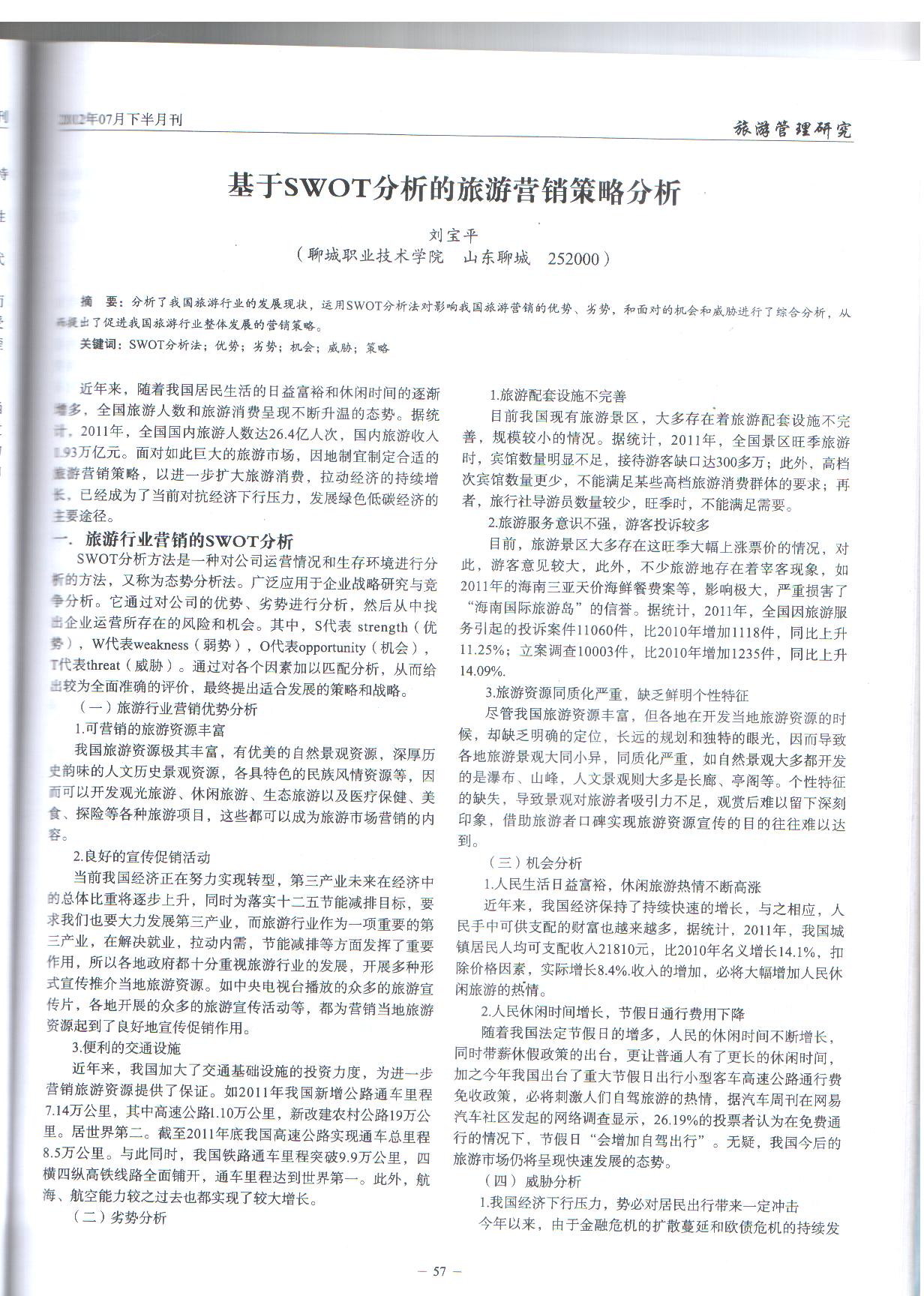 劉寶平在《旅游縱覽》(國(guó)家級(jí))發(fā)表文章《基于SWOT分析的旅游營(yíng)銷策略分析》