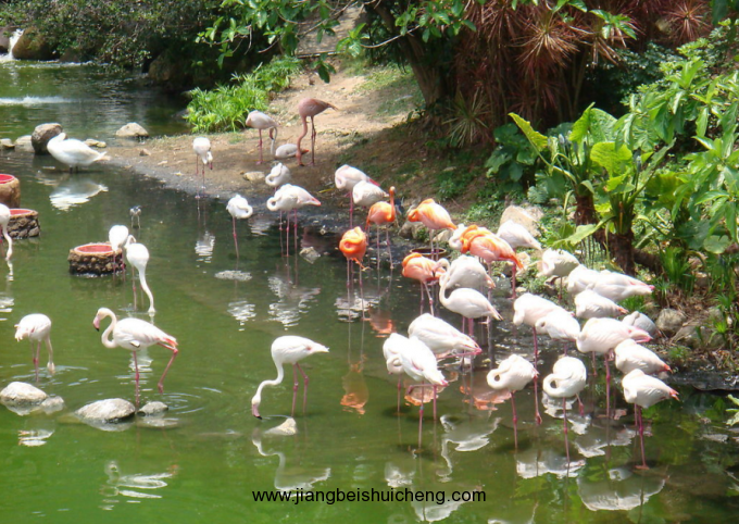 百鳥居設(shè)計(jì)獨(dú)特,一個(gè)由5條巨柱支撐的巨型不銹鋼絲網(wǎng),罩著面積達(dá)2500平方米的空間。內(nèi)分4區(qū):地棲鳥類區(qū)、森林鳥類區(qū)、叢林鳥類區(qū)及水禽鳥類區(qū),共有鳥3000余只。