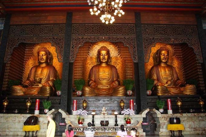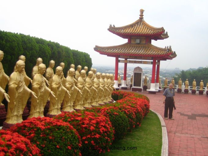大接引寺的后面是佛光山寺廟建筑群。大雄寶殿居于各殿中間,殿內(nèi)塑有高約7米的三尊大佛像,中為娑婆世界教主迦牟尼佛,右為西方極樂世界教主阿彌陀佛,左為東方琉璃世界教主藥師佛,均為盤膝坐蓮金身。大殿四壁上建有14600個(gè)佛龕,各龕均供奉一尊小佛像,佛前裝小燈,殿內(nèi)14600個(gè)長明燈映著一尊大佛,版權(quán)所有,山東聊城聊之旅國際旅行社有限公司,轉(zhuǎn)載必究!金碧輝煌,其氣派令全臺(tái)所有佛寺殿堂都望塵莫及。位于大雄寶殿右面的是大悲殿,高20米,殿中供奉一尊高約7米、呈立姿手持凈瓶的觀音菩薩,殿堂四壁建有1萬個(gè)神龕,供奉1萬尊小觀音神像。滿殿盡是大慈大悲的觀音菩薩,故殿名又叫“萬佛大悲殿”。與大悲殿相對(duì)屹立的為大智殿,殿中供奉文殊菩薩,據(jù)傳他曾為眾生說法,故有“大智”之稱。佛光山還有“佛教文物陳列館”(大愿殿)和“凈土洞窯”(極樂世界)兩處“隱形式”建筑,以“凈土洞窯”為著名。所謂“凈土洞窯”即自山麓挖入山腹的地洞,右洞入,左洞出,內(nèi)里形成“冂”形地道,布有1250個(gè)佛像以及傳道講經(jīng)等場景,洞壁塑繪有西方三圣等極樂世界的想象造型,在中國寺廟建筑中極為罕見。諸大殿建筑面積共達(dá)50多萬平方米,風(fēng)格雖各不相同,宏偉莊嚴(yán)則一。