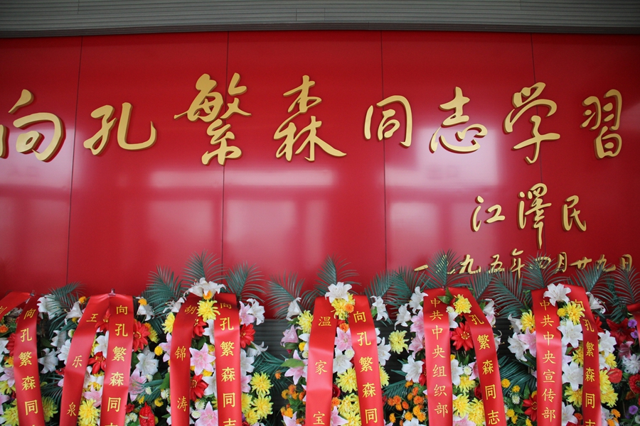 這里有國家領(lǐng)導(dǎo)和各界人士敬獻(xiàn)的花籃,讓我們向孔繁森同志學(xué)習(xí)。