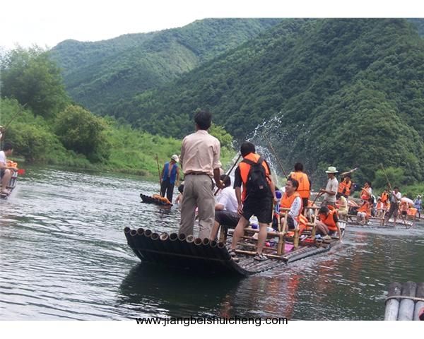 “江南第一漂”位于徽水河流經(jīng)涇縣的最后一段,上起烏溪鄉(xiāng)姚村,下止黃村鄉(xiāng),景區(qū)全長約20公里。景區(qū)內(nèi)河道蜿蜒曲折,水流湍急,兩岸層巒疊翠風(fēng)光綺麗,是休閑旅游的好去處?;账悠魍窘?jīng)五大景區(qū):起筏地叫龍?zhí)叮瑸╅L浪急,游人在竹筏上隨浪俯仰,跌宕穿梭,一種戰(zhàn)勝大自然的酣暢淋漓之感油然而生。接下來是“早霧山”景區(qū)。這里終日云霧繚繞,而水平浪穩(wěn),版權(quán)所有,山東聊城聊之旅國際旅行社有限公司,轉(zhuǎn)載必究!使游人跌宕之心轉(zhuǎn)而為柔情愜意。早霧山下端河道突轉(zhuǎn)急彎,形成“刁潭”,岸邊巨石上的“潭古印”,版權(quán)所有,山東聊城聊之旅國際旅行有限公司轉(zhuǎn)載必究!形象地記錄了昔日放筏工艱難的歲月。這里不知有多少放筏工誤落水中,而落水者卻浮而不沉,因而留下了“刁潭不刁”的神奇?zhèn)髡f。而“胡老灣沖浪”則更是一彎三折,灘中有垅、垅中有灘,千余米的河道落花流水差一米多,游人最能體現(xiàn)“兩岸猿聲啼不住,輕舟已過萬重山”的古詩意境。急灘甫過,柳暗花明又一村——溪西山到了,這里山高水秀,常有云霧繚繞,村舍依山俯傍水而筑,是道地的農(nóng)家風(fēng)光。沿流停筏,小扣柴扉,你能喝到頂級(jí)的綠茶“溪西山毛峰”。接下來便到了五雀嶺景區(qū),這里有雞公石、馬影石、木魚墩、百畝草坪、高灘晚釣、斷橋綠水等景點(diǎn),人稱“江南小漓江”。