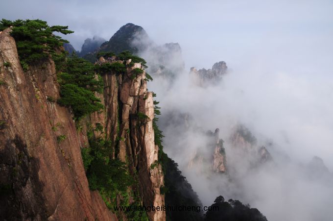 始信峰的特點(diǎn)是巧石爭(zhēng)妍,奇松林立,三面臨空,懸崖千丈,云蒸霞蔚,風(fēng)姿獨(dú)秀。