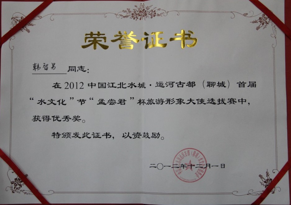 熱烈祝賀聊之旅國際旅行社導(dǎo)游部成員韓智男獲得聊城水文化節(jié)優(yōu)秀獎(jiǎng)