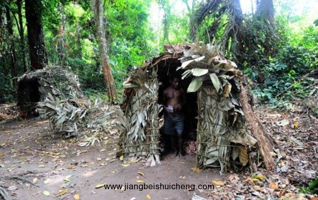 一刻鐘后,我們來到了一塊林中空地。只見芭蕉和芒果樹圍繞的空地上蓋有三五茅舍,幾個手持梭鏢的卑格米人已經(jīng)在路口相迎。他們有的赤膊,有的穿T恤;他們果然長得很矮,最高的大概也只有1米40左右,大部分都是1米30左右。他們挺胸凸肚,走起路來好像都有點外八字,連肚臍眼都特別向外突出。那些茅舍都是用樹枝、藤蔓、樹皮和樹葉糊上泥土搭成的,非常簡易,好像經(jīng)不起稍微大一點的風吹。茅舍里面空空如也,幾乎沒有什么可以稱為家具的東西。幾個婦女正坐在一個茅舍涼亭里,旁邊是一些鍋碗類的炊具,好像是剛吃了飯在聊天。幾個孩子在旁邊跑來跑去,從外表看,完全是一幅普通的民間風俗圖。