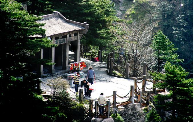 從飛來石往北走1公里,即是排云亭。排云亭位于西海門,建于民國24年。這里視野開闊,是觀賞黃山巧石奇景的最佳地點(diǎn)。因?yàn)槲骱r(shí)有云霧在山谷中升騰翻滾,撲至石亭前卻又消散,故名“排云亭”。