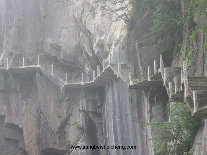 天都峰,途中有一段長10余米,寬僅1米的“鯽魚背”,兩側是千仞懸崖,深邃莫測,其形頗似出沒于波濤之中的魚之背,故名。自上而下,坡陡達85度左右,若遇風吹云涌,仿佛山搖石動,游客至此無不戰(zhàn)戰(zhàn)兢兢,有“天都欲上路難通”感慨。民國二十六年(1937)建登峰梯道,長3里,有1564級臺階,194個石欄干和600米鐵索,保障游人安全攀登絕頂。1984年于峰腰另辟新徑至峰頂。站在峰頭遠眺,云山相接,江河一線,俯瞰群山,千峰競秀,風光無比壯麗。古有詩贊曰:“任他五岳歸來客,一見天都也叫奇?!泵裰{云:“不到天都峰,白跑一場空。”意為此峰為游黃山必游之地。