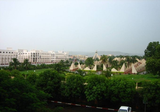 南面是使館區(qū)和一片片新建的住宅區(qū)。市內(nèi)最高建筑物是塔尖高聳的清真寺,電視發(fā)射塔和17層的友誼賓館。市中心繁華的商業(yè)區(qū)中,經(jīng)營(yíng)巴黎高檔時(shí)裝的商人同擺地?cái)偨匈u的小販,現(xiàn)代化商店同非洲傳統(tǒng)市場(chǎng)相毗鄰。