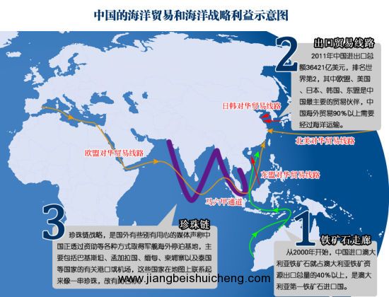 中國有1.8萬公里海岸線,是一個(gè)名副其實(shí)的海洋大國,但并不是一個(gè)海洋強(qiáng)國。中國與鄰近一些國家存在海域劃分及領(lǐng)土爭(zhēng)端, 維護(hù)近海海域的合法權(quán)益一直是中國海上力量的首要目標(biāo)。但是隨著中國經(jīng)濟(jì)的快速發(fā)展,對(duì)海外資源需求的迅速增加,以及對(duì)外貿(mào)易依存度的增大,海運(yùn)航線特別是世界能源中心的印度洋海上安全成為一個(gè)無法避免并有待應(yīng)對(duì)的課題。作為世界頭號(hào)貿(mào)易大國,中國建立貿(mào)易網(wǎng)絡(luò)的基礎(chǔ)是海上運(yùn)輸通道的構(gòu)建與暢通,特別是中國進(jìn)口石油與對(duì)外貿(mào)易通道主要集中于印度洋地區(qū)。印度洋海上通道是中國經(jīng)濟(jì)的命脈,中國貨物進(jìn)出口量的約一半必須通過印度洋進(jìn)入中東、非洲、歐洲及美 洲。近年中國的海外石油主要來自中東和非洲,進(jìn)口份額分別約為50%和25%。我國從沙特、安哥拉、伊朗、蘇丹、阿曼、伊拉克、科威特和利比亞進(jìn)口的石油都必須途經(jīng)印度洋。未來數(shù)十年,印度洋區(qū)域仍將是中國全球能源和自然資源的主要供應(yīng)地,以及投資和商品市場(chǎng)的主要地區(qū)。印度洋地區(qū)是21世紀(jì)中國維護(hù)國家安全、經(jīng)濟(jì)利益繞不開的區(qū)域??v觀印度洋的重要戰(zhàn)略地位,就能夠洞悉21世紀(jì)的國際權(quán)力政治局勢(shì)。對(duì)處于新國際環(huán)境中的中國而言,印度洋的重要性主要體現(xiàn)在以下幾個(gè)方面: