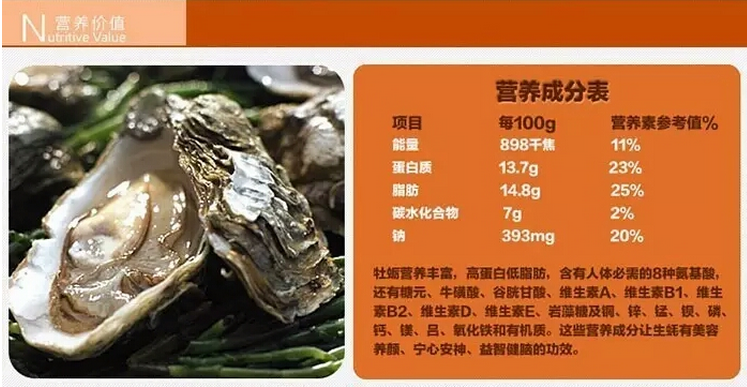 牡蠣是一種高蛋白低脂肪,易消化且營養(yǎng)豐富的食品,其含有豐富的鋅,甘氨酸和一種名為肝糖原的糖類物質(zhì),也是牡蠣美味的基礎(chǔ)。