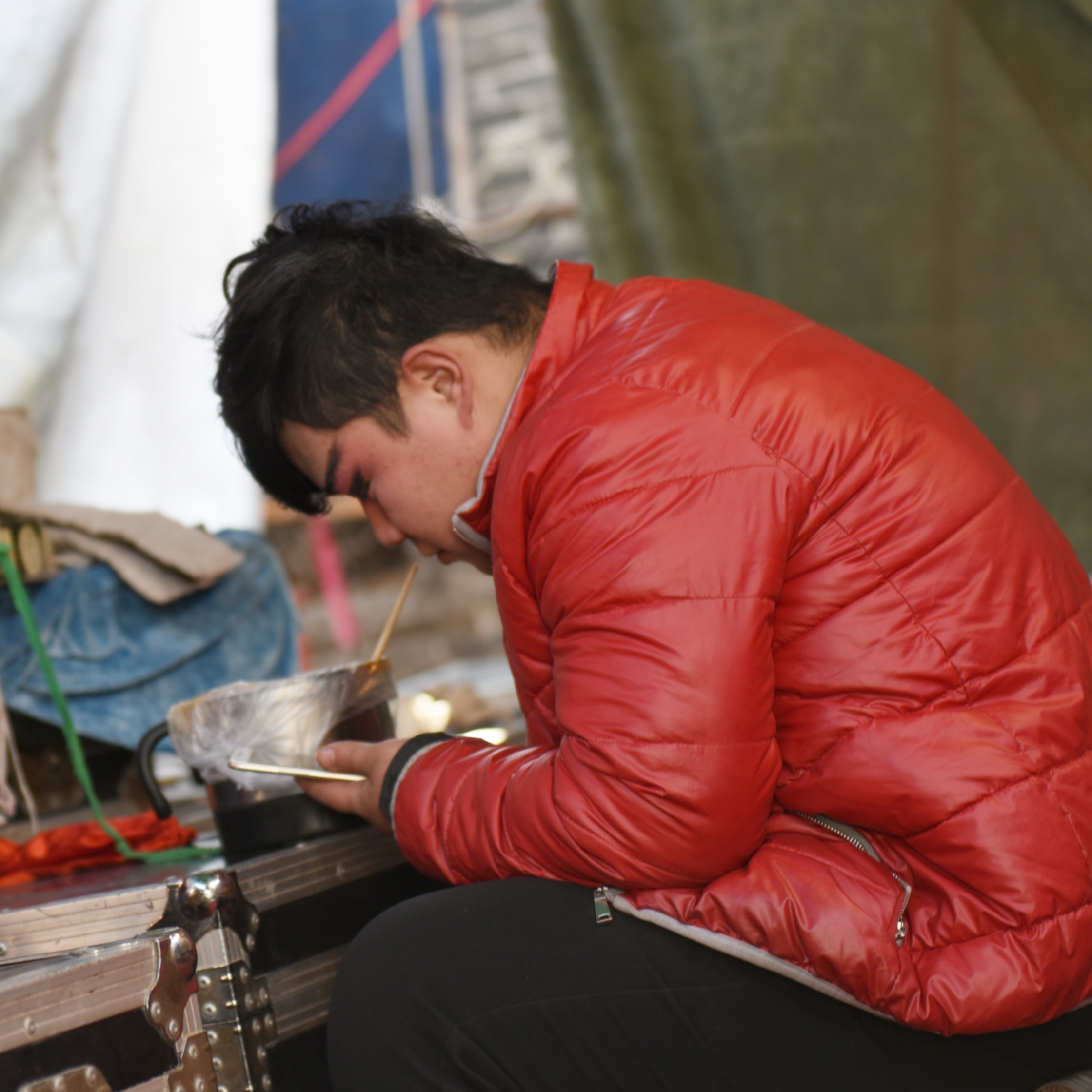 童年的記憶中我們這些頑皮的孩子,也不會(huì)依偎在父母的身旁去看、去聽自己不懂的戲曲,忙碌的后臺(tái)倒是吸引著我們的好奇心,演員的化妝、上臺(tái)前的準(zhǔn)備、五顏綠色的戲服、一張張的大花臉,都是那么的新奇、好玩。當(dāng)然此刻的我們還是那么的好奇,只是現(xiàn)在的手中多了一部單反。