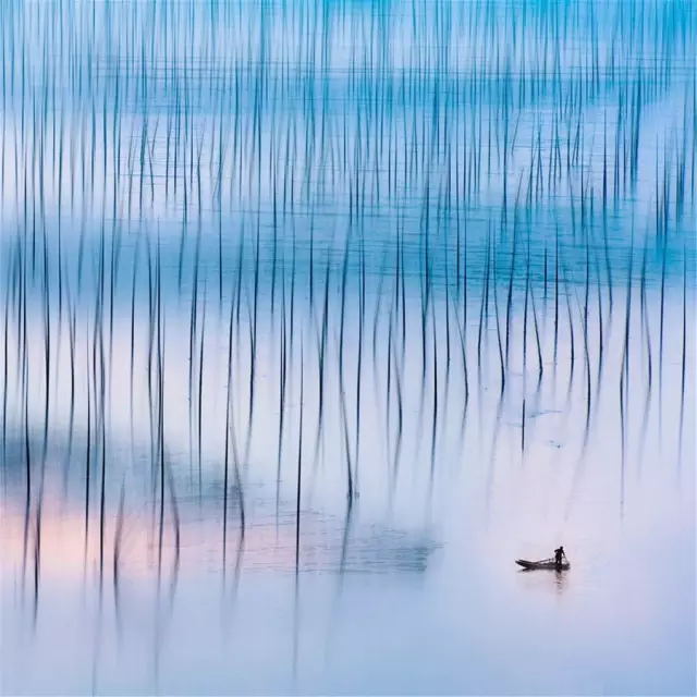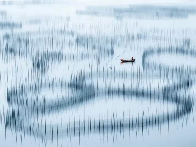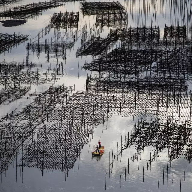 霞浦灘涂大面積的海上養(yǎng)殖,為灘涂添加了線條和規(guī)則的幾何圖案,可以利用這些圖案組成單一節(jié)奏感很強的畫面。
