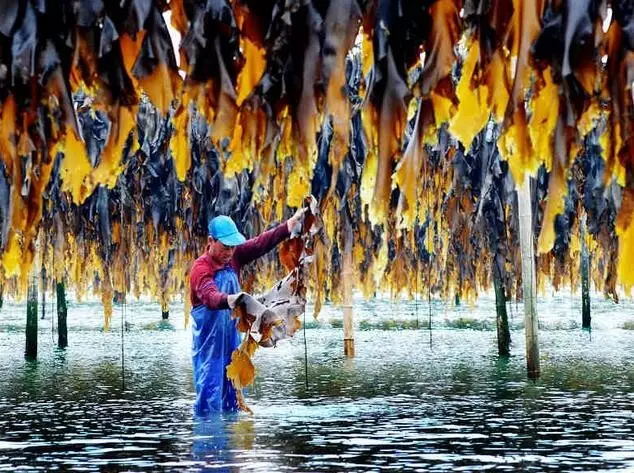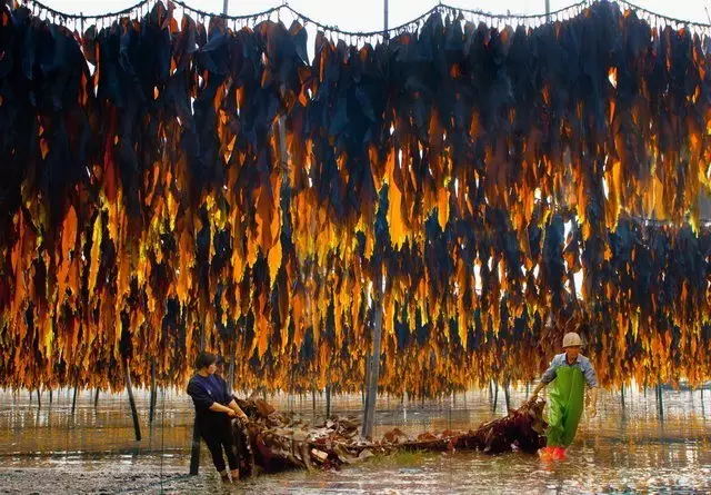 還有曬海帶,適合用中焦進行近景拍攝,這樣能夠體現(xiàn)出曬海帶的過程,和曬海帶的壯觀景象,并可以在日落前運用逆光拍攝,逆光可以表現(xiàn)出海帶的通透質(zhì)感。