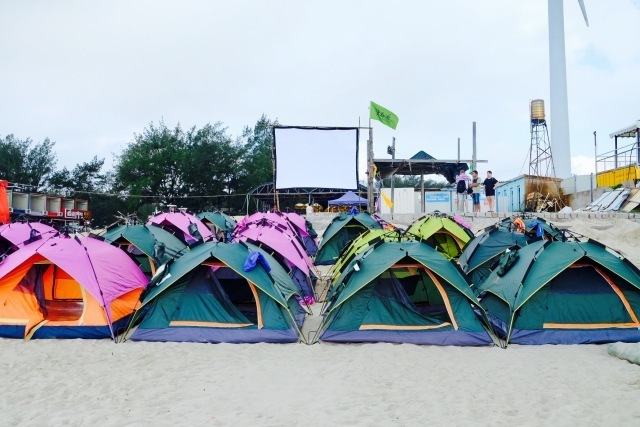晚上沙灘房車(chē)汽車(chē)自駕營(yíng)地里搭帳篷住一晚,在夜里看見(jiàn)滿天繁星。