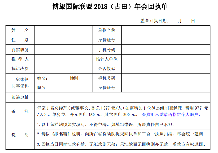 3、參會單位須如實填報《博旅國際聯(lián)盟 2018 年會回執(zhí)單》,連同年會匯款回單截圖按指定發(fā)送確認(下詳)。