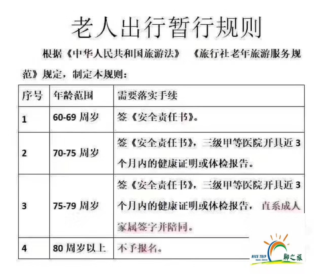 【旅游局新規(guī)】 80周歲以上 旅行社不允許接待了 75-79周歲 家屬陪同+體檢證明 70-75周歲 體檢證明+責任書 60-69周歲 簽署安全責任書 這不是說說而已,一定要重視起來! 旅游制度越來越規(guī)范,國家越來越重視,旅游還是要趁年輕!