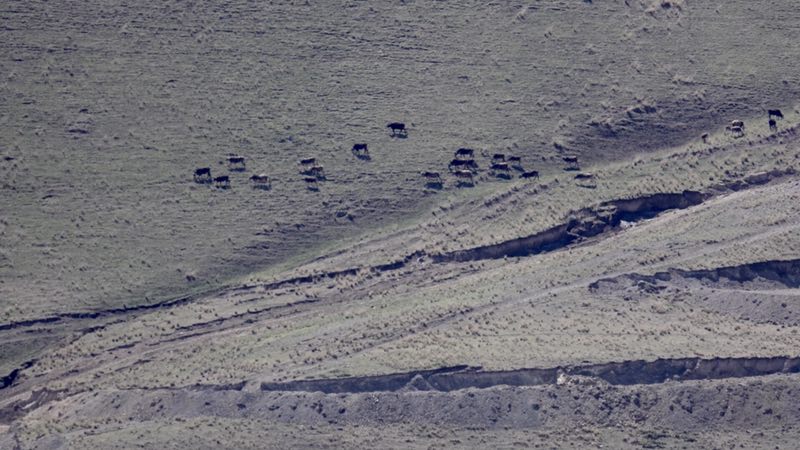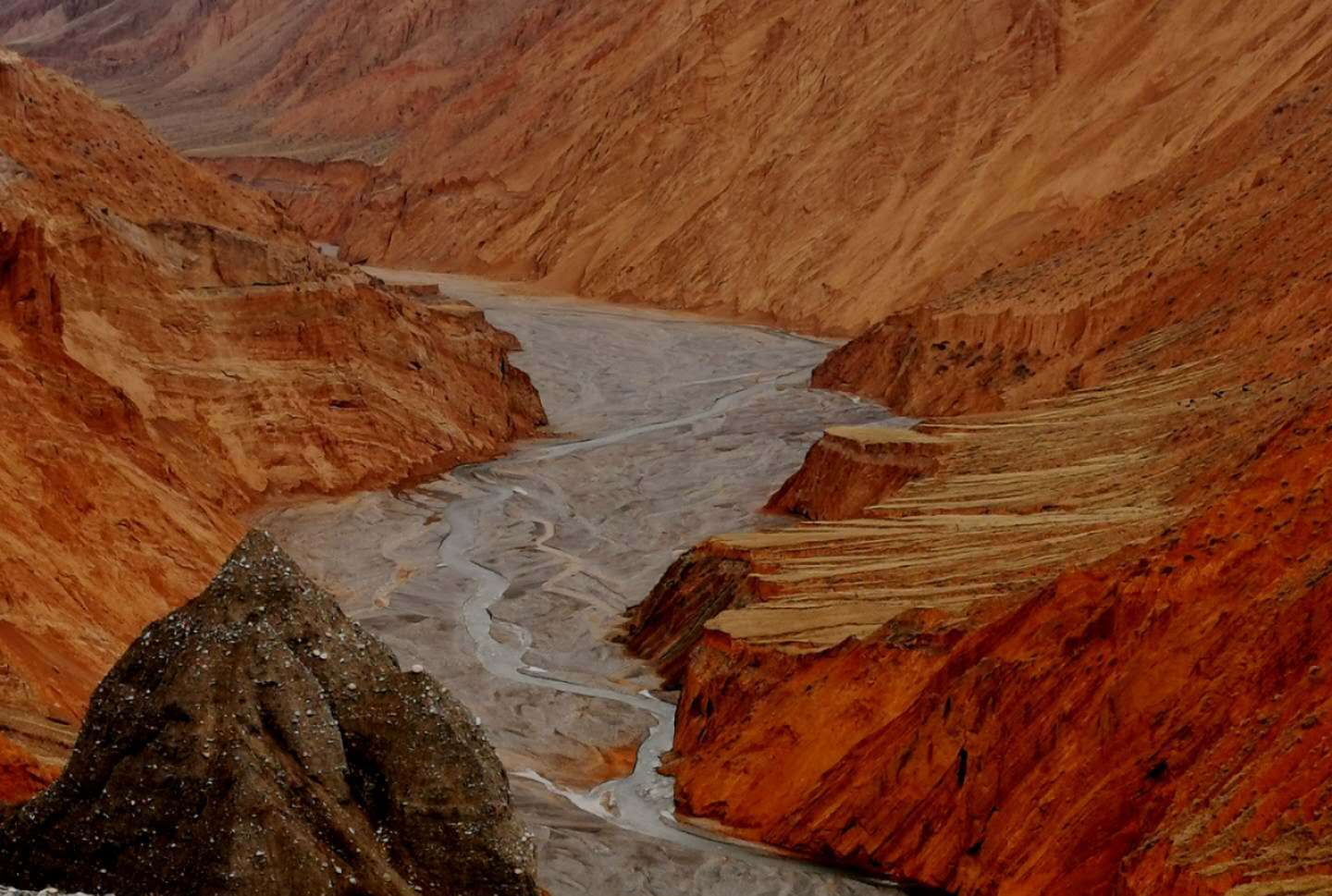 這是一個(gè)多彩的峽谷,河水是黃色的,一段峽谷的顏色是灰色的,遠(yuǎn)處藍(lán)天白云下,連綿的雪山,近處是綠色的草甸。另一段峽谷的顏色是大片的紅色,如赤紅的丹霞,這應(yīng)該是紅山大峽谷名字的來(lái)歷吧。