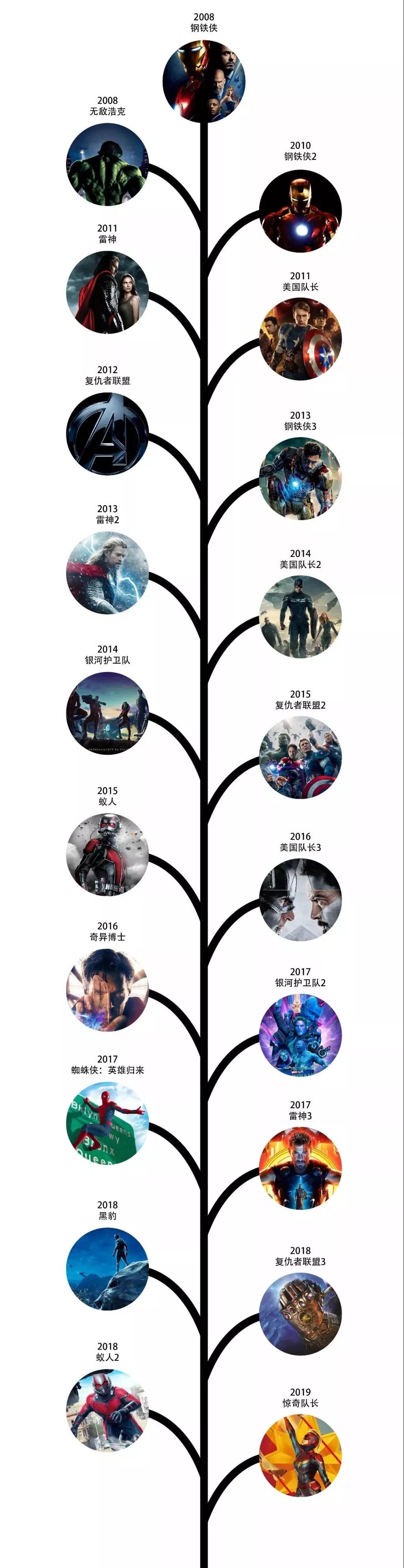 第三階段:從2016年開始,到2019年結(jié)束:美國(guó)隊(duì)長(zhǎng)3、奇異博士、銀河護(hù)衛(wèi)隊(duì)2、蜘蛛俠、雷神3、黑豹、復(fù)仇者聯(lián)盟3、蟻人2、驚奇隊(duì)長(zhǎng)、復(fù)仇者聯(lián)盟4。