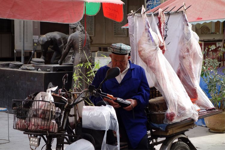 賣羊肉的流動攤販。當?shù)氐难蛉鈨r格和我們家鄉(xiāng)差不多,30多元一斤,不過都是帶著骨頭的,好大好肥的羊肉耶。導游是濟南人,他每次回家探親都買很多的羊肉用保鮮箱發(fā)回家。