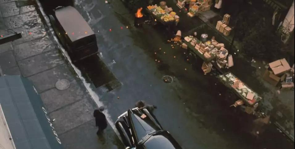 比如令人難忘的開(kāi)場(chǎng)拉遠(yuǎn)鏡頭,和維托遇襲時(shí)的俯視鏡頭。