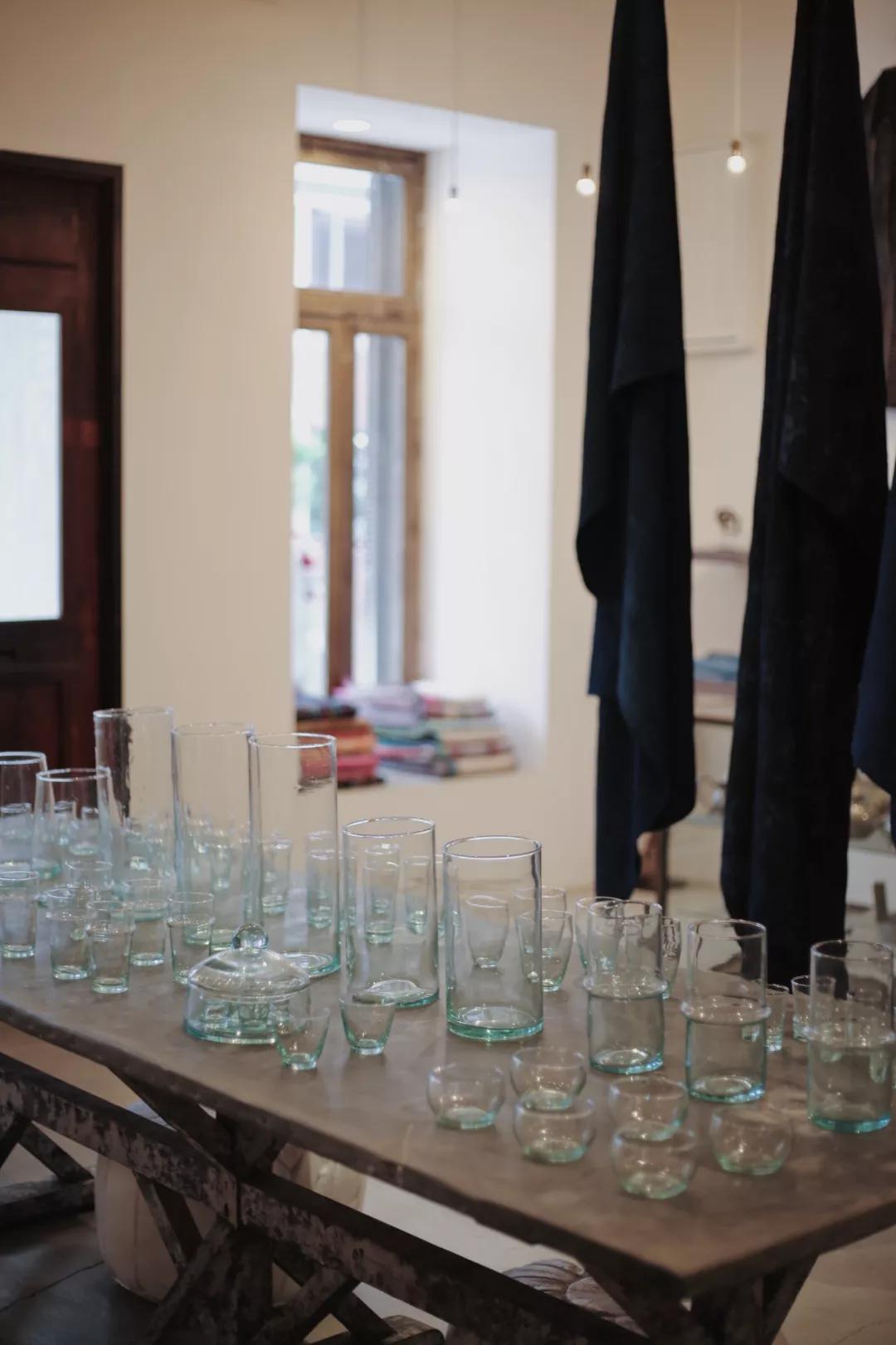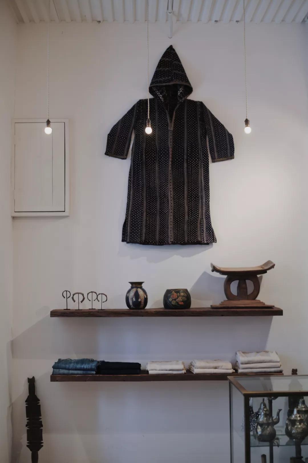 空間里迷人的老舊味道實在太吸引人,木桌上一水兒的玻璃器具,想著買一把花束插在里頭,應(yīng)該會很好看。摩洛哥的杯子,剛果的掛毯,中非的竹籃,印度的木工藝,充滿異國情調(diào)的手工制品,就這樣看似隨意地擱置著,每一件都似會呼吸般充滿靈氣。