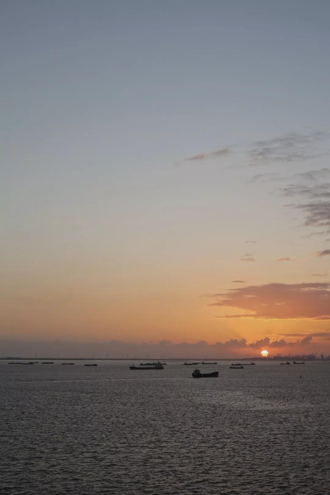 清晨的甲板安靜極了,大概前一晚喧鬧的人們正在酣睡,晨風(fēng)吹得衣袂飛揚。天空中的黃暈已經(jīng)從沉睡中蘇醒,帶著不刺眼的光芒從飄渺的云霧里一點點伏起,天越來越亮。