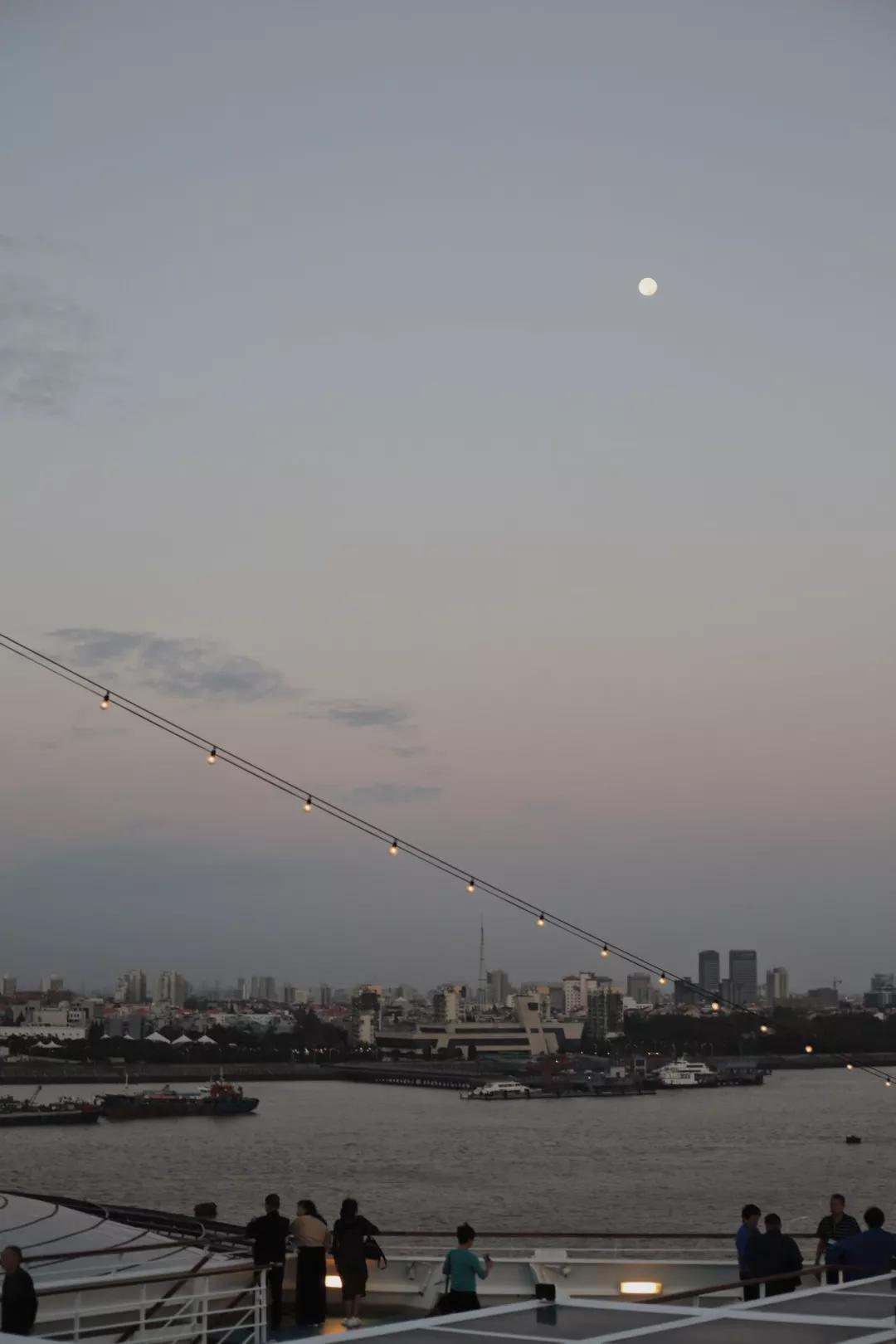 晚餐過后,登上甲板眺望茫茫大海。高懸的圓月穿透薄云,在海天相交處灑下一道朦朧的錦緞。浪花層層翻卷,交疊耳語,耳邊明明有起伏的風(fēng)聲,心里仍覺得萬籟俱寂,恍然從遠(yuǎn)方涌起德彪西寧靜的和弦。
