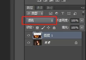 然后選中光斑圖片,將它的類型改變成“濾色”,這時候再來看看效果,很明顯光斑圖片已經(jīng)變得類似于透明的了。至于這里的不透明度,大家可以不用管它,因為后面可以通過色階來進行改變。